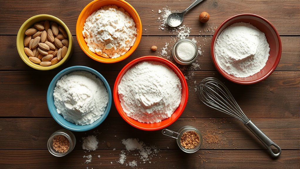 If you’re storing almond flour, you’ll want to follow specific storage tips to extend its shelf life. Keep it in an airtight container in a cool, dark pantry or refrigerator to prevent spoilage. Unlike wheat flour, gluten-free flours often have a shorter shelf life and are more prone to rancidity, so proper storage is crucial. By doing so, you guarantee fresh baking every time and avoid waste.