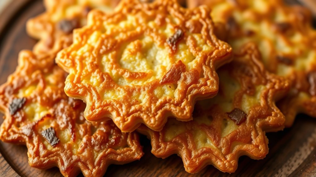 Traditional recipes often call for simple ingredients: grated potatoes, onions, eggs, and a little flour or matzah meal. These ingredients come together quickly, but the real magic happens in the frying. As you monitor the heat, you’ll notice how the batter crisps up beautifully, creating a satisfying crunch with each bite. Once cooked, you transfer the latkes to a paper towel-lined plate to drain excess oil, guaranteeing they stay crisp rather than greasy. Serve them hot with traditional toppings like applesauce or sour cream, and you’ll find they’re instantly addictive.