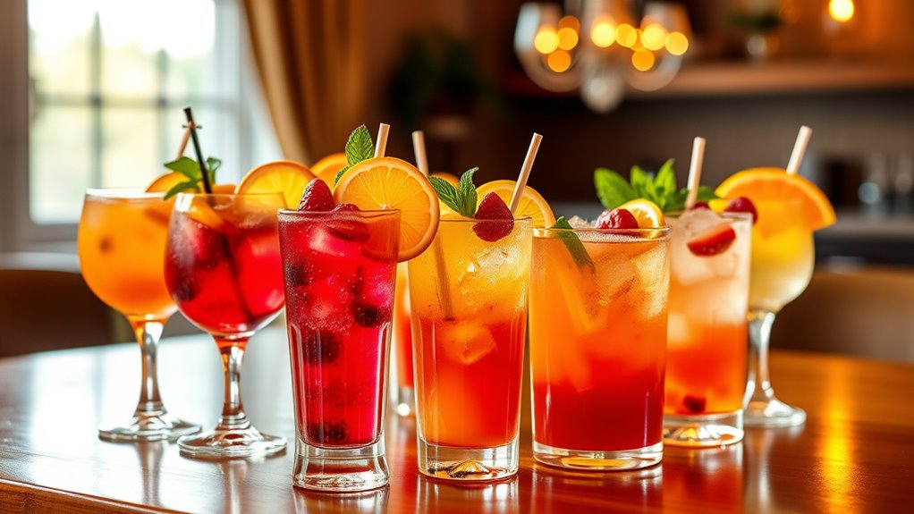 To create festive nonalcoholic punches and mocktails, focus on vibrant flavors paired with seasonal garnishes like cranberries, citrus twists, and aromatic herbs such as rosemary or thyme. Use colorful ingredients and attractive glassware to make your drinks visually appealing, while adding warm spices like cinnamon and star anise for cozy warmth. Thoughtful presentation and creative combinations can turn simple mocktails into memorable holiday treats—keep exploring for more inspiring tips to elevate your serve.