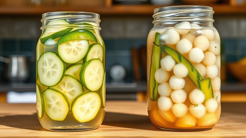 Have you ever wondered how to turn fresh vegetables into tangy, crunchy treats that last for months? Pickling is a fantastic way to preserve seasonal produce, and understanding the different methods can help you decide which is best for your kitchen. When it comes to fermentation benefits, fermented pickles stand out because they use natural bacteria to transform the vegetables over time. This process not only creates complex flavors but also boosts your gut health by introducing probiotics. However, ensuring pickling safety is essential. Proper technique and sanitation are fundamental to prevent harmful bacteria from taking hold. That said, fermentation is generally safe if you follow trusted recipes and maintain good hygiene.