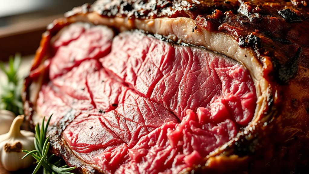 Proper timing and searing techniques are essential for a perfectly cooked prime rib. Begin by bringing the beef to room temperature to ensure even cooking. Preheat your oven to the ideal temperature, usually around 450°F (232°C), to achieve a beautiful sear. Sear the roast on high heat for about 15-20 minutes to develop a flavorful crust. Then, lower the oven temperature to about 325°F (163°C) and continue roasting until the internal temperature reaches your desired level of doneness. Use a reliable meat thermometer to monitor progress; for rare, aim for 125°F (52°C), while medium rare is about 135°F (57°C). Rest the meat for at least 15 minutes before carving to allow juices to redistribute. Additionally, understanding the flushing toilet functionality can help prevent plumbing issues that might disrupt holiday gatherings.