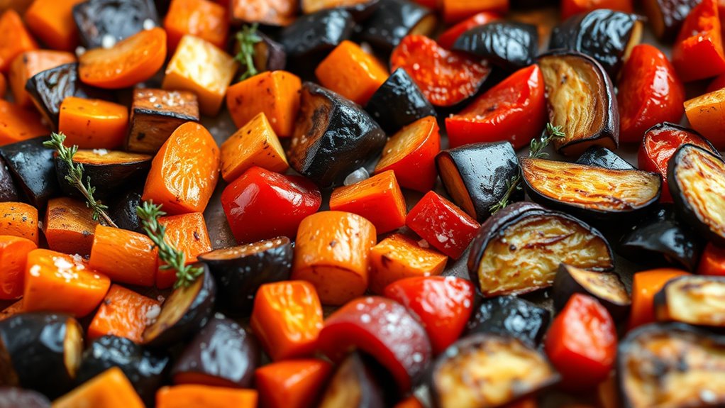 You should roast vegetables for about 25 to 35 minutes to achieve ideal caramelization. Keep an eye on their texture, as timing adjustments might be necessary based on your oven or vegetable size. Turn them halfway to promote even browning, and remove when they’re tender and golden brown. Remember, patience guarantees maximum flavor development, so don’t rush the process—proper timing brings out the best caramelized taste.