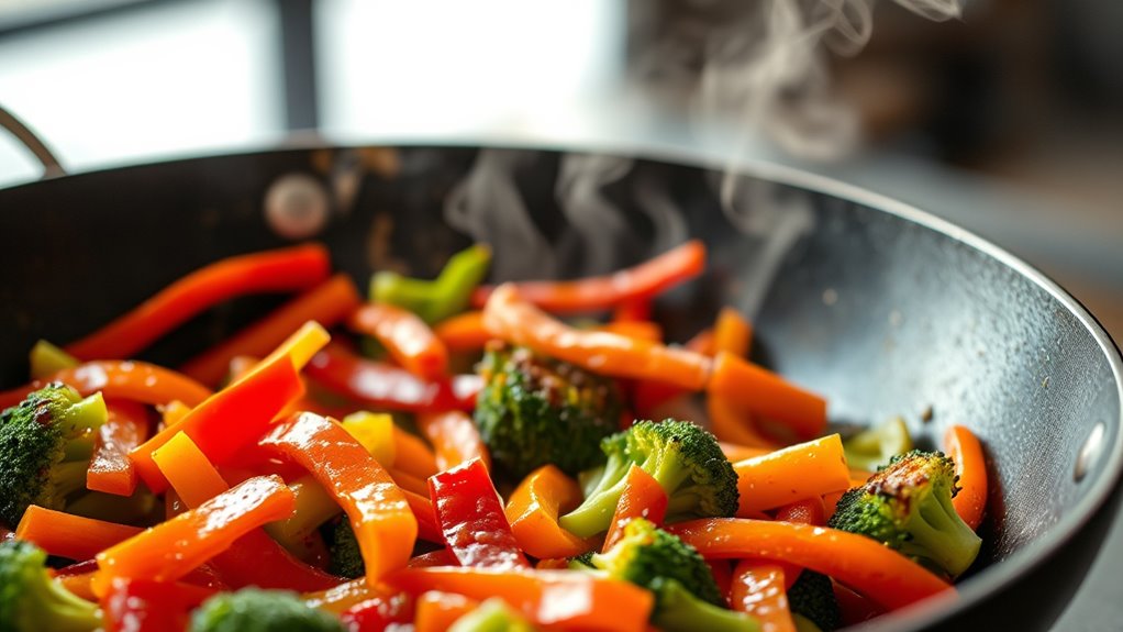Have you ever wondered how to achieve perfectly cooked, flavorful stir-fries every time? The key lies in mastering the right wok temperature and ingredient prep. When you get these elements right, you’ll open that irresistible wok hei, the smoky aroma that defines authentic stir-fries. First, focus on your wok temperature. It needs to be hot enough to sear ingredients quickly, sealing in flavors and maintaining a crisp texture. To test if your wok’s hot enough, sprinkle a few drops of water—if they dance and evaporate instantly, your wok is ready. If it cools down too quickly or the water just sizzles away slowly, give it more time to heat up. A properly heated wok ensures your ingredients cook evenly and develop that characteristic smoky flavor. Regular use of high-temperature stir-frying can also help in controlling oil absorption and improving overall dish quality.