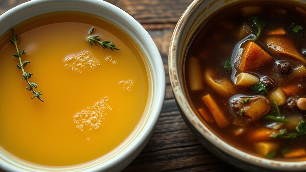 Whether you choose stock or broth, remember they’re like siblings with different personalities—stock is the quiet builder, while broth is the ready-to-eat friend. Knowing when to use each helps you craft dishes that shine. Think of stock as the foundation of a house, and broth as the inviting room inside. Mastering their differences lets you turn simple ingredients into culinary magic—your kitchen’s canvas just got a whole lot more vibrant.