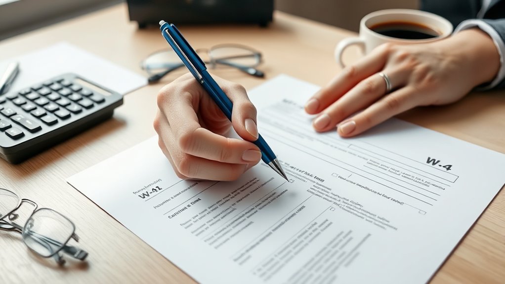 If you don’t submit a W-4, your employer will withhold taxes at the highest rate, which could lead to overpaying or underpaying your taxes. This impacts your tax implications when you file your return, and you might owe a large amount if you haven’t adjusted withholding. Missing the filing deadlines for your W-4 can also cause penalties or delays, so it’s best to submit it promptly to guarantee accurate withholding.