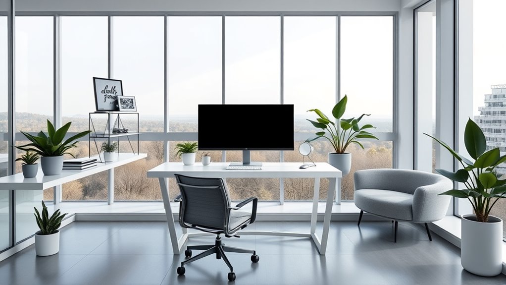 To create the perfect home office in 2025, blend natural elements like plants and sustainable materials for a calming atmosphere. Prioritize ergonomic furniture and adjustable desks for comfort and health. Incorporate smart technology such as automatic lighting and high-speed internet to boost productivity. Maximize natural light with thoughtful window placement, and add biophilic touches to enhance well-being. Keep exploring to uncover more innovative ideas for transforming your workspace into a true sanctuary.