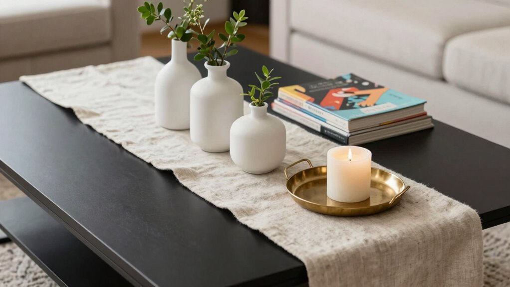 You can easily style your coffee table on a budget by incorporating affordable accessories like candles, vases, or decorative trays. Get creative with DIY decor projects, such as painting small stones or creating homemade centerpieces. Mix and match these affordable pieces to add personality without overspending. Keep your look simple and balanced, and you’ll achieve a stylish, effortless vibe that feels personalized and inviting.