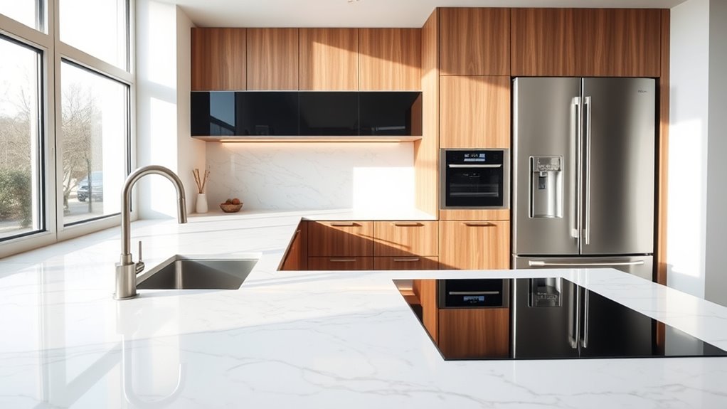 Technology integration transforms your kitchen work zone by making tasks more efficient. You’ll love smart appliances that connect seamlessly, allowing you to control cooking, cleaning, and storage with ease. Voice control lets you manage devices hands-free, saving time and reducing clutter. This modern approach streamlines your workflow, enhances convenience, and creates a more functional space tailored to your needs, making your kitchen smarter and more enjoyable to work in every day.