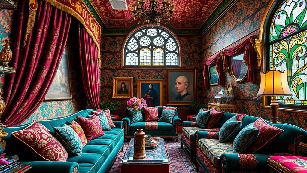 In maximalist interiors, you create vibrant spaces by boldly layering patterns and colors. Mix florals with geometrics, stripes with intricate motifs, and combine cultural influences with personal touches. Use contrast and repetition to find balance, making each piece tell a story. Bright hues energize the room, while softer tones ground it. Trust your instincts to craft a lively, personalized environment. Keep exploring—there’s so much more to uncover in this colorful, expressive style.
