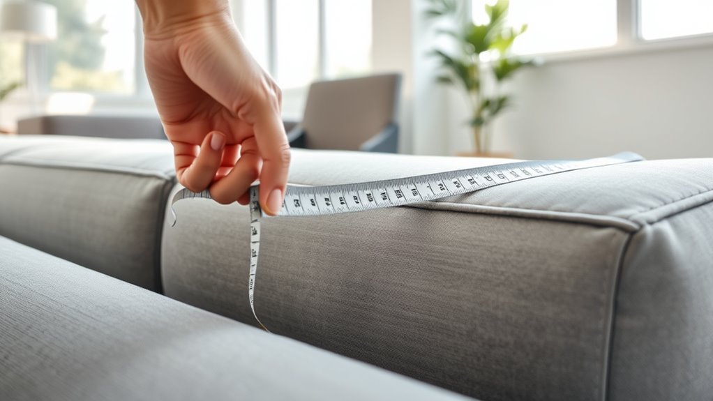 You should measure furniture with the cushions in place to get an accurate overall size, including cushion thickness. Measure from the back to the front, accounting for the cushions’ height to guarantee proper fit. Keep in mind, cushions add to the furniture depth, so if you’re planning for space, consider this extra thickness. This way, you’ll know exactly how the piece will fit in your space with cushions included.