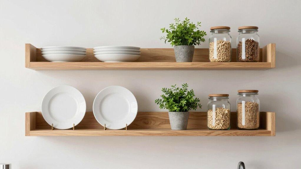 Keeping your open shelves clutter-free isn’t just about aesthetics—research suggests it can actually boost your mood and reduce stress. By setting clear display limits, choosing meaningful items, and maintaining regular refreshes, you create a space that’s both beautiful and calming. Think of it as an artful balance; a cluttered shelf can overwhelm your mind. Embrace these limits, and you’ll find your shelves becoming a personal sanctuary that lifts your entire space.