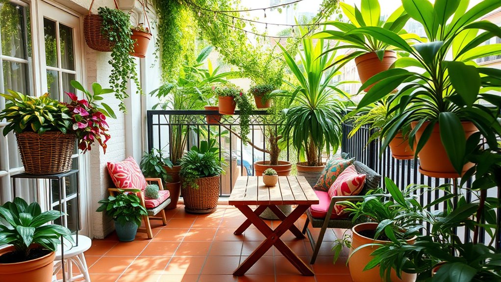 For shaded balconies, you should choose indoor plant options that thrive in low light. Consider low light greenery like pothos, snake plants, or ZZ plants—they’re resilient and require minimal sunlight. These plants add vibrant greenery without needing direct sun, making your balcony inviting and lively. By selecting these hardy options, you create a lush, low-maintenance space perfect for relaxation and enjoying your outdoor area, even in shade.