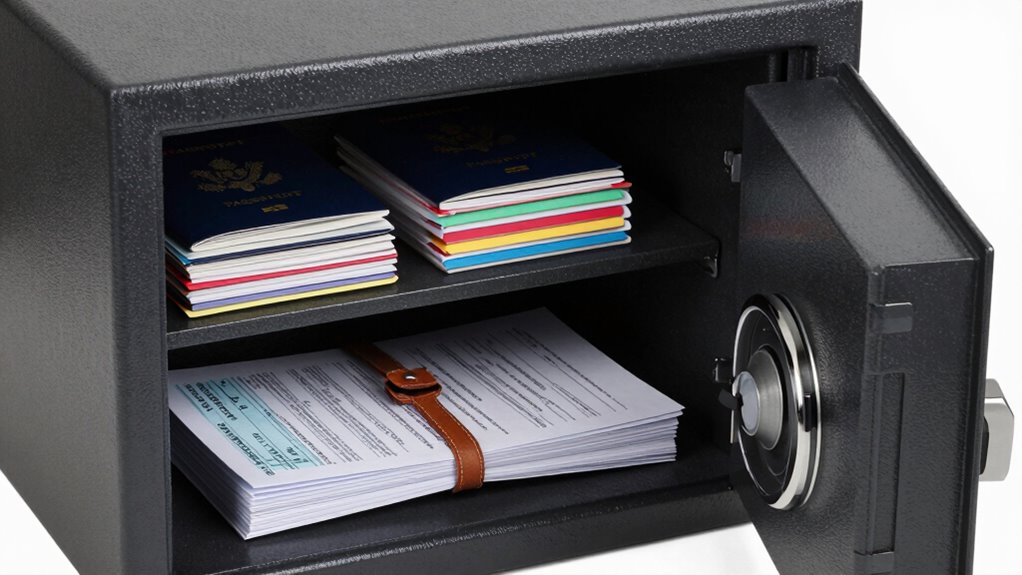 First, consider the significance of physical safes. They’re simple but highly effective tools to keep your physical documents secure from theft, fire, or flood damage. A sturdy, fireproof safe placed in a discreet location can protect your passports, deeds, and tax papers from physical threats. When choosing a safe, look for one with fire and water resistance, solid construction, and reliable locking mechanisms. It’s best to keep the safe in a hidden spot that isn’t obvious to intruders, such as a closet or basement corner. Remember, the goal is to prevent unauthorized access while ensuring quick retrieval when needed.