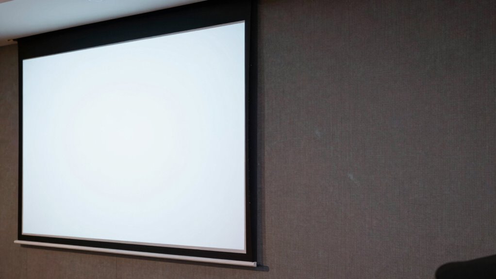 Choosing the right screen for your UST projector is like planting a seed—you’ll see your image bloom vividly only on the perfect surface. I once set up my projector on a mismatched screen, and everything looked dull—until I switched to a specialized screen, and suddenly, colors exploded like fireworks. Remember, your screen choice can transform your space from ordinary to extraordinary, making every movie night feel like a private cinema. Don’t settle; let your screen be the canvas for your visual masterpiece.