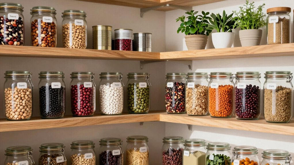 Ever wondered how to keep your pantry organized and easy to navigate? The key is creating well-defined pantry zones with organized shelving and effective label systems. When you segment your pantry into specific zones, you streamline your cooking process and reduce food waste. Imagine reaching for a can of beans or a bag of rice and knowing exactly where it belongs without rummaging through clutter. This setup not only saves time but also helps you keep track of what you have, preventing expired products from slipping past you.