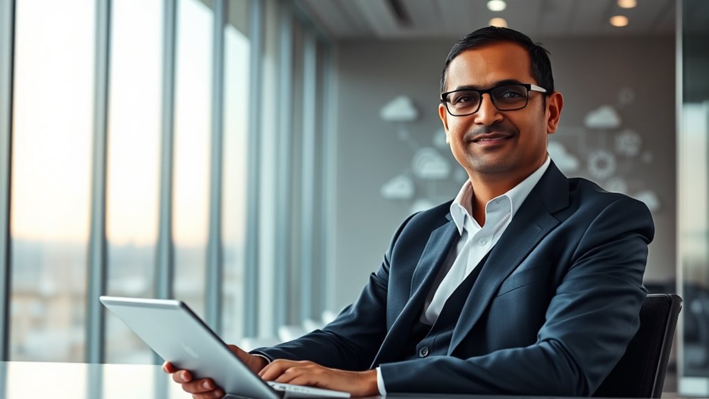 By 2025, your estimate of Satya Nadella’s net worth is largely influenced by his stock holdings and performance-based pay from Microsoft’s ongoing growth. His leadership has driven the company’s success in cloud computing, AI, and innovation, boosting its valuation and stock value. As a result, his wealth continues to rise through stock appreciation and bonuses tied to Microsoft’s achievements. Keep exploring to uncover even more about his strategic influence and financial trajectory.