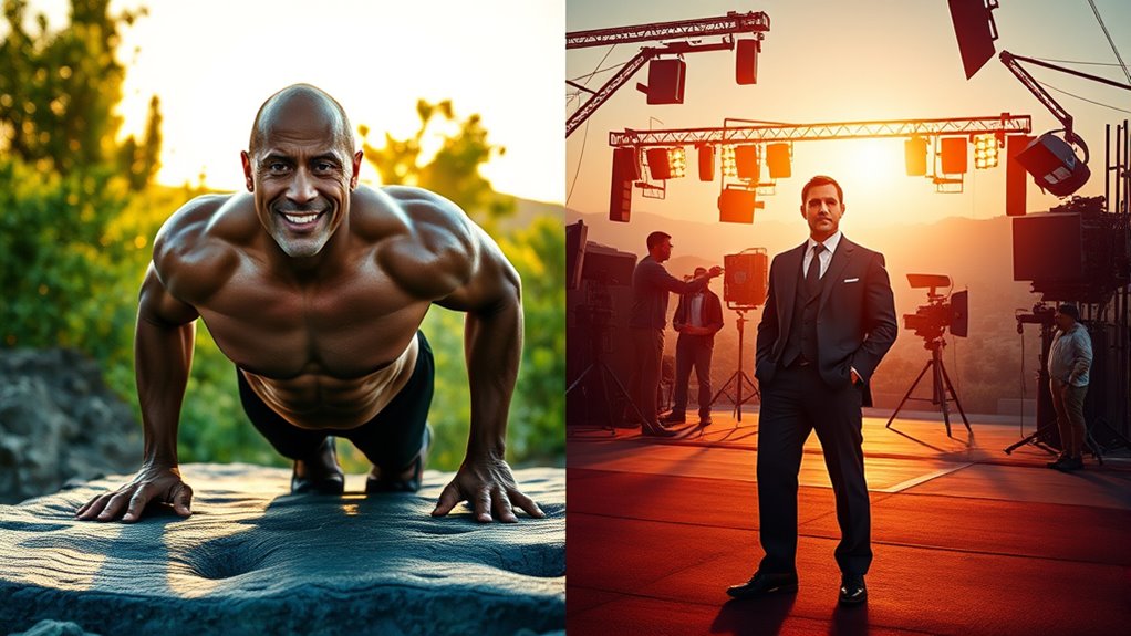 Start your day as Dwayne Johnson does, with a wake-up between 3:30 and 4:00 a.m., fueling up with coffee, stretching, and hitting your personal gym for cardio and weight training. Fuel your body with multiple meals, balancing lean proteins and carbs, and stay committed to your routines for peak performance. As the day progresses, juggle filming, business pursuits, and family time. Stick around to uncover more secrets behind his disciplined routine and success.