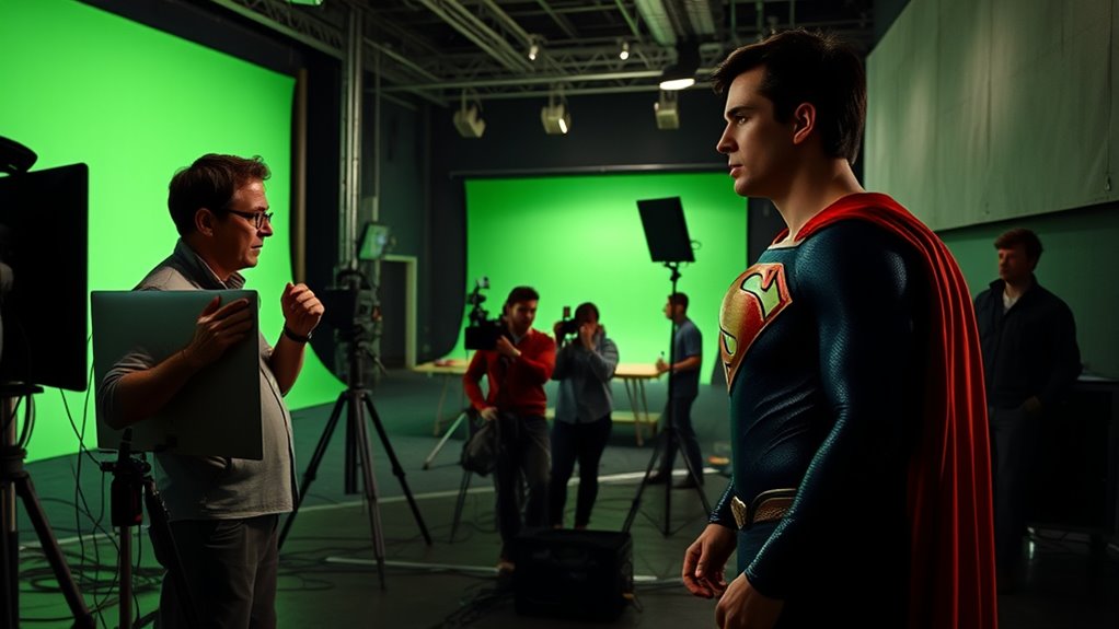 Ever wonder how they make Superman’s powers feel real? You’ll see that the film emphasizes practical effects, like wirework and in-camera tricks, to bring flight and heat vision to life. They also use cutting-edge virtual production technology, like LED stages, to create immersive environments. This hybrid approach makes the action more authentic, blending physical effects with digital enhancements to keep Superman’s iconic abilities believable and visually stunning.