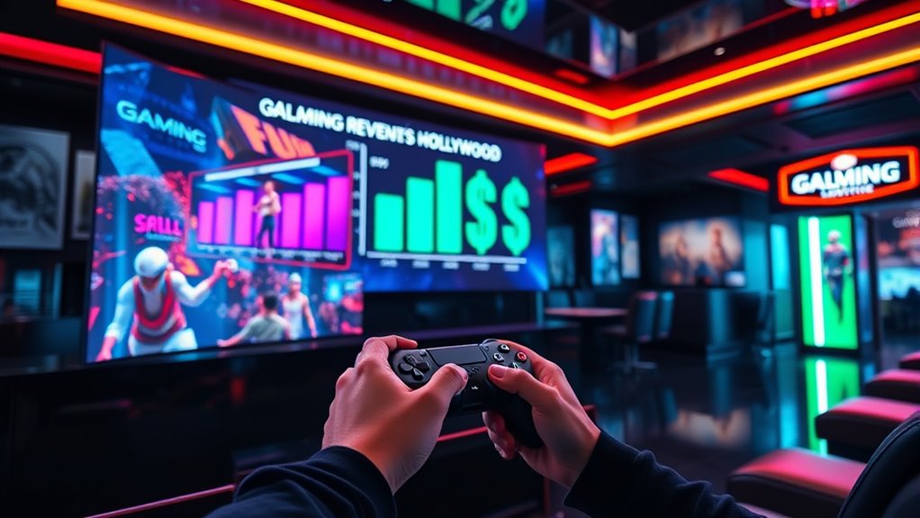 You notice gaming revenues vastly surpass Hollywood’s box office earnings globally. In 2025, gaming hits around $188.9 billion, driven by digital sales, in-game purchases, and mobile gaming. Meanwhile, Hollywood’s box office revenue stays around $40-50 billion, with streaming and merchandise adding to overall income. You see gaming’s diversified, digital-first approach, attracting a broader and more consistent global audience compared to traditional cinema, highlighting gaming’s dominant financial position.