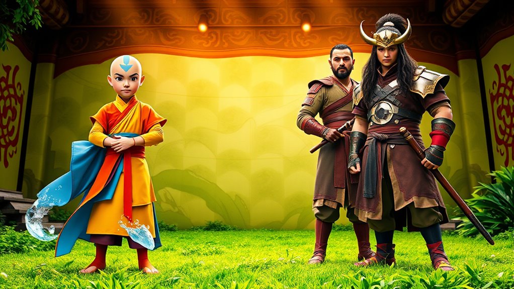 The live-action *Avatar: The Last Airbender* on Netflix features a diverse and talented cast that brings fresh energy to the beloved characters. You’ll see Dallas Liu as Zuko, Elizabeth Yu as Azula, and other actors dedicated to authentic performances. The casting emphasizes representation to better reflect the global audience. If you keep exploring, you’ll discover more about the creative team, production details, and how these choices shape this exciting adaptation.