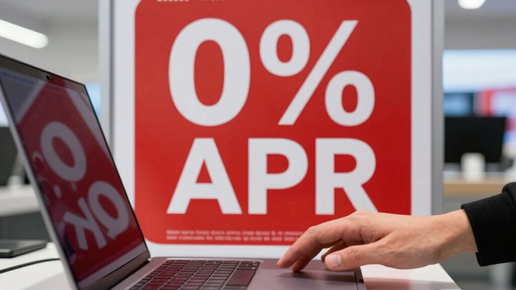Have you ever wondered how 0% APR promotions work? These offers allow you to finance a purchase without paying interest during a specific period, called the promotional period. Your credit score plays a vital role in qualifying for these deals; a higher score increases your chances of approval and better terms. During the promotional period, you can make payments without accumulating interest, saving you money. However, it’s essential to understand that once the promotional period ends, any remaining balance may be charged interest at the standard rate. To benefit fully, you should plan to pay off the balance before the promo expires. Additionally, understanding your affiliate disclosures and privacy settings can help manage how your information is used during promotional offers. Being aware of cookie categories and managing your cookie preferences can also influence your online experience and the personalization of advertisements related to these promotions. Furthermore, it’s important to read the fine print carefully to avoid unexpected costs or penalties once the promotional period concludes. Knowing how credit reporting works can help you maintain a good credit score during the promotional period, ensuring you qualify for the best offers. Also, understanding buy now, pay later options can help you make informed financial decisions while utilizing these promotions.