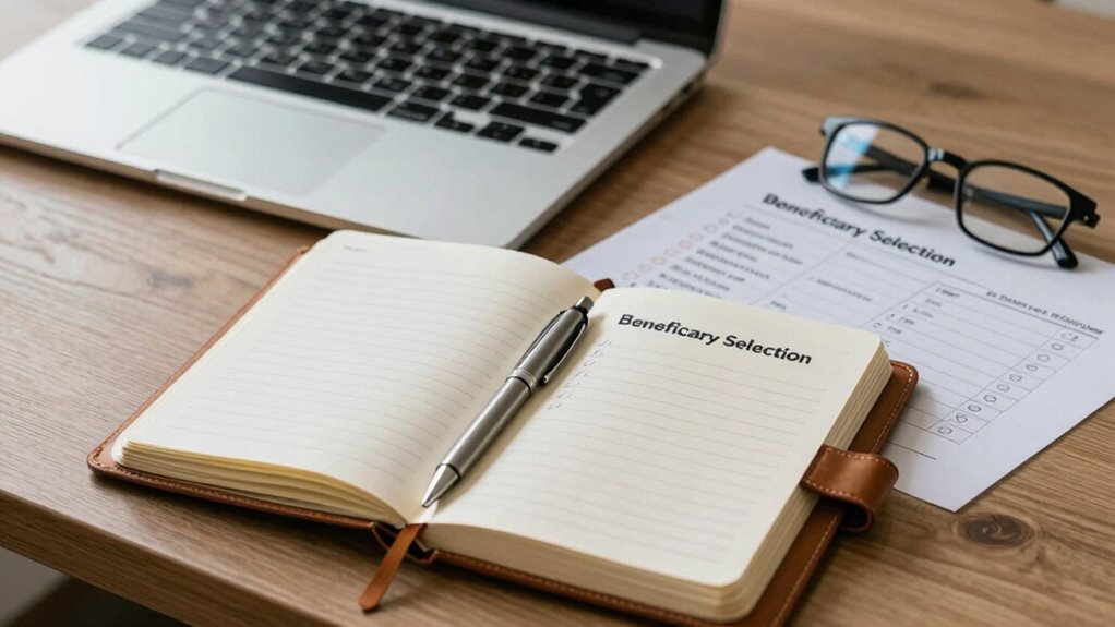 To select a beneficiary effectively, start by identifying trusted individuals or entities, like family members, charities, or trusts. Confirm their full legal names and contact details to prevent confusion. Consider their reliability and intentions, and be specific in your designations. Regularly review and update your choices, especially after life changes. Avoid vague terms and make certain all accounts are aligned. Continuing with these steps will help you prevent future legal or family issues.