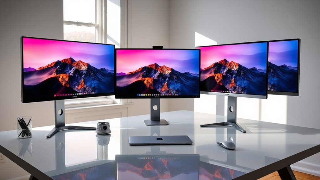 In 2025, I’ve found the best 5K monitors for my MacBook Pro really enhance my setup. The Apple Studio Display offers incredible color accuracy and detail, with models featuring adjustable stands and Nano-Texture Glass to reduce glare. I appreciate their seamless connectivity through USB-C and Thunderbolt ports. Plus, they’re perfect for creative work, even if gaming isn’t their strong suit. Stick around, and I’ll share more insights on choosing the right monitor for you!