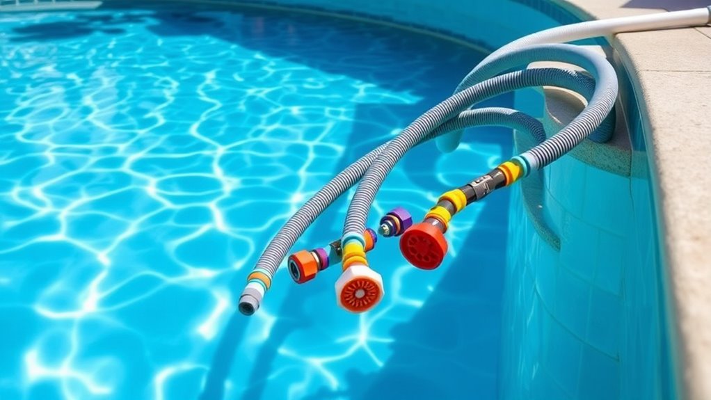 Think of hoses and attachments like a puzzle—each piece needs to fit perfectly. Compatibility issues can arise if brands aren’t designed to work together, like mismatched puzzle pieces. I always check manufacturer specs and compatibility charts before buying. Using universal fittings or adapters can bridge gaps, ensuring everything connects smoothly. This way, your pool cleaning system functions seamlessly, transforming maintenance from a chore into effortless enjoyment.