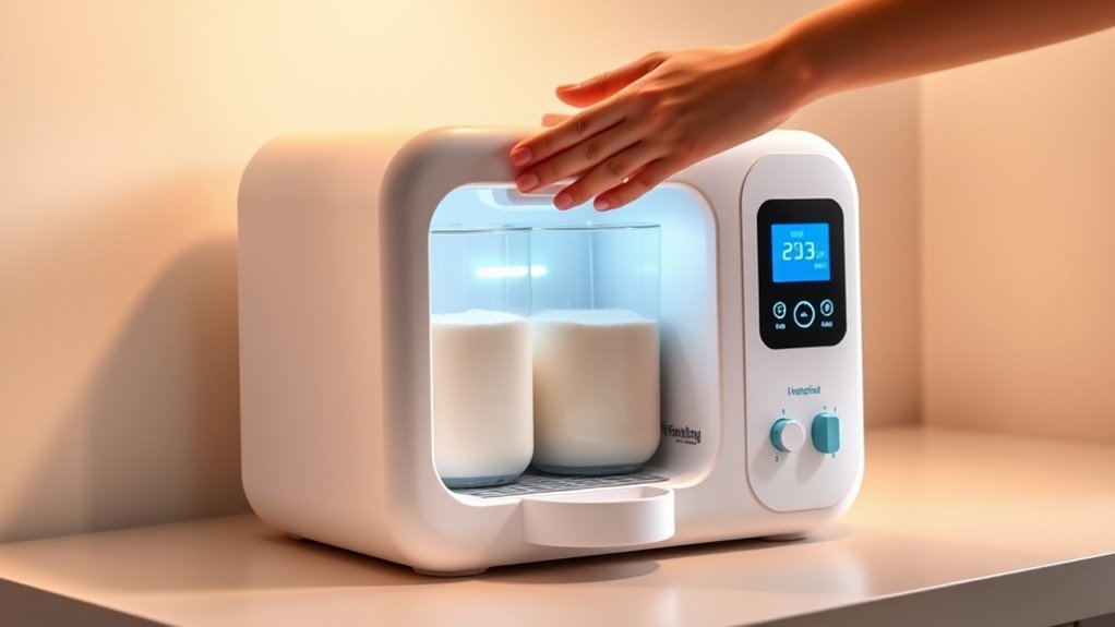 If you’re looking for the best baby formula dispensers with precise temperature control, I recommend considering options like GROWNSY’s bottle warmer, Baby Brezza’s advanced dispenser, and instant formula makers with app control. These devices heat quickly, keep formula at the perfect temp, and feature safety locks and easy cleaning. They make nighttime feedings so much simpler and stress-free. Keep going to discover more detailed features and tips to choose the perfect one for your family.