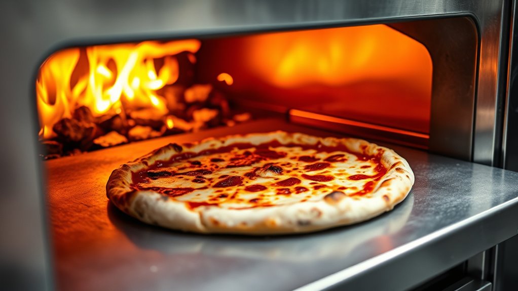Rapid heating speed is essential for efficient operation, especially in high-volume settings where time is vital. Higher wattage and advanced heating elements enable ovens to reach 800°C (1472°F) or more quickly, often in under 10 minutes. Faster heat-up times reduce wait times, allowing for more pizzas to be prepared in less time. They also help achieve a better crust crispiness and more evenly cooked toppings by minimizing heat loss during preheating. The power-to-temperature ratio is crucial, as it determines how effectively the oven can reach and sustain ultra-high temperatures needed for authentic stone-baked results. Consistent, rapid heating ensures the oven maintains the desired temperature throughout cooking, leading to uniform, professional-quality pizzas every time.