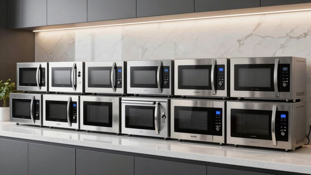 Finding the right size and capacity for your countertop microwave convection combo is key to making it fit seamlessly into your kitchen and meet your cooking needs. First, measure your available countertop space to ensure the unit fits comfortably without overcrowding. Interior capacity, usually between 0.8 and 1.5 cubic feet, determines how well it handles larger dishes or multiple items at once. Keep in mind that bigger capacity models tend to be larger externally, so double-check your kitchen layout can support the size. Also, larger units can be heavier, affecting portability and installation options. Striking a balance between your cooking requirements and available space guarantees you get a functional, convenient appliance that enhances your kitchen without sacrificing space or ease of use.