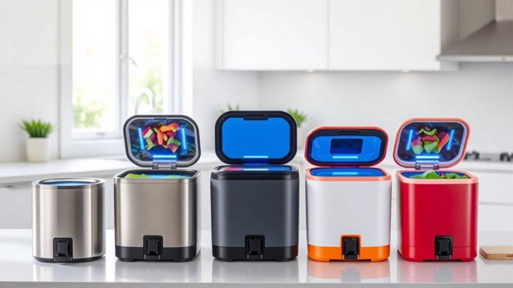 In 2025, I recommend five top electric compost bins that make kitchen waste easy, odor-free, and eco-friendly. The Vitamix FC-50, Reencle Prime, NutriChef, AMZCHEF, and a kitchen composter offer fast composting, quiet operation, and great odor control. They come in sizes suitable for different households and are simple to use and maintain. Want to discover which model fits your needs and how they work? Keep exploring to find out more.