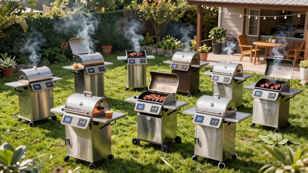 If you’re looking for the best electric smokers for your backyard in 2026, I’ve found 15 top models that offer reliable heat, versatile cooking options, and durable outdoor construction. From compact units to larger, feature-rich smokers, these options cater to different needs and budgets. They include models with digital controls, built-in probes, and weather-resistant designs. Keep going, and you’ll discover detailed insights to help you pick the perfect smoker for your outdoor adventures.