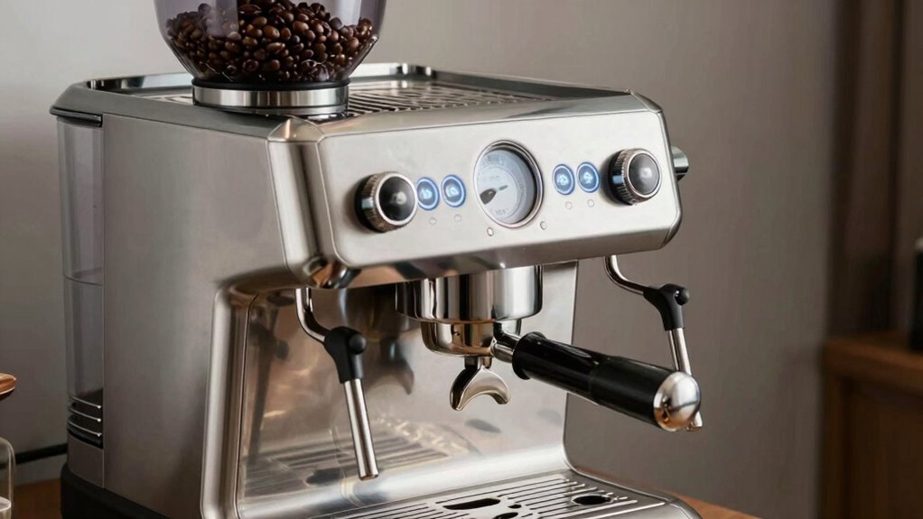 Choosing an espresso machine with advanced brewing technology can make a significant difference in your coffee quality. Features like PID temperature control and pre-infusion systems guarantee precise extraction, delivering consistent flavor every time. Multiple grind settings, often from 15 to 44, let me customize the grind size based on beans and drink preferences. High-pressure pumps, between 15 and 20 bars, are essential for creating rich crema and full-bodied espresso. Integrated conical burr grinders provide uniform grounds that preserve flavor, with some machines offering digital or manual adjustments. Real-time pressure monitoring and touchscreen controls help me fine-tune brewing parameters, giving a personalized coffee experience. These innovative features simplify the brewing process while elevating the quality of each shot.