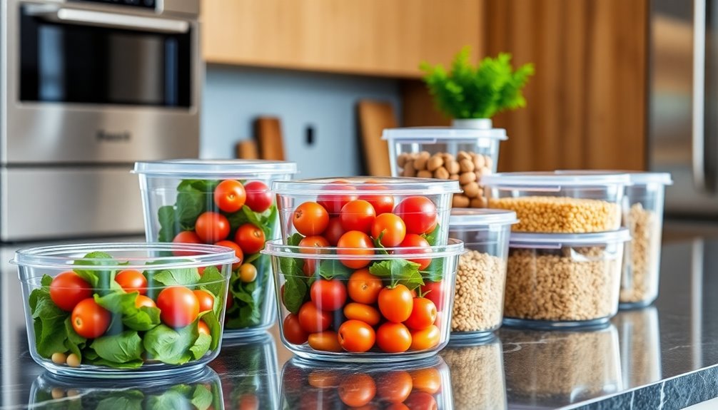 To keep my food fresh and flavorful, I always prioritize airtight sealing mechanisms in my storage containers. These seals are essential for preventing air, moisture, and contaminants from ruining my food. I love containers that feature silicone gaskets and locking lids, as they provide a secure seal and enhance leak-proof capabilities. With airtight containers, I can greatly extend the shelf life of perishables, dry goods, and leftovers, reducing spoilage and maintaining quality. Plus, I appreciate built-in vents for microwave use; they allow me to heat food without making a mess while keeping everything sealed. Choosing containers with airtight seals is a game changer for keeping odors at bay and ensuring my meals taste just as good later on!