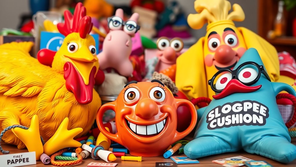If you want to make everyone laugh, I suggest some great funny gag gifts like the Bull$#*t book, a hilarious belly apron, or the screaming goat figure. The Bull$#*t book offers crazy facts, while the apron and glow-in-the-dark button are perfect for parties. Plus, plush chicken nuggets, funny pens, and bacon air fresheners add humor to any occasion. Curious? Keep exploring for even more hilarious ideas guaranteed to get laughs!