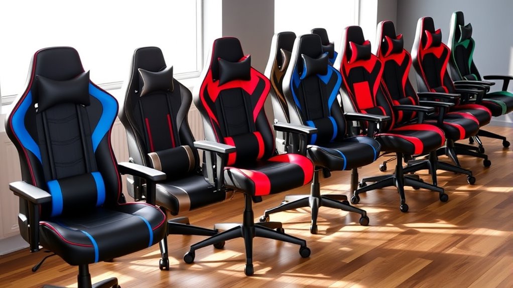 Are you aware of how much a warranty can impact your overall investment in a gaming chair with lumbar support? A longer warranty, like 12 months, offers peace of mind by covering manufacturing defects and issues, especially with higher-priced models. Price points vary widely—from budget options under $100 to premium chairs exceeding $300—reflecting differences in materials, features, and durability. Cheaper chairs often come with limited or no warranties, so it’s essential to evaluate whether the price matches the warranty support. Investing in a chair with an extensive warranty can save you money on repairs or replacements down the line. Ultimately, balancing price and warranty helps ensure you get a quality chair that offers both comfort and long-term value.
