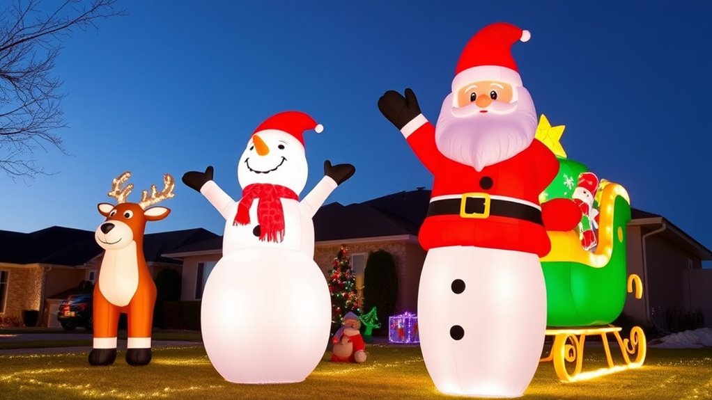 If you want to transform your yard into the neighborhood’s favorite, I suggest checking out giant inflatables between 12 and 20 feet tall. Options like Santa, snowmen, pumpkins, and arches with LED lights make a bold, festive statement. They’re durable, weather-resistant, and easy to set up and store, ensuring your display looks great all season. If you’re curious about the best picks, keep going—there’s plenty more to discover.
