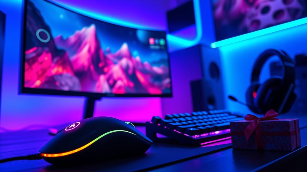 I understand budget-friendly gifts might seem small, but they can make a big impact. I recommend a quality gaming mouse or a comfortable gaming headset—these essentials improve gameplay without breaking the bank. Even small accessories like LED strip lights or a fun gaming mug can brighten their setup. Thoughtful, affordable gifts show you care and can truly elevate their gaming experience without overspending.