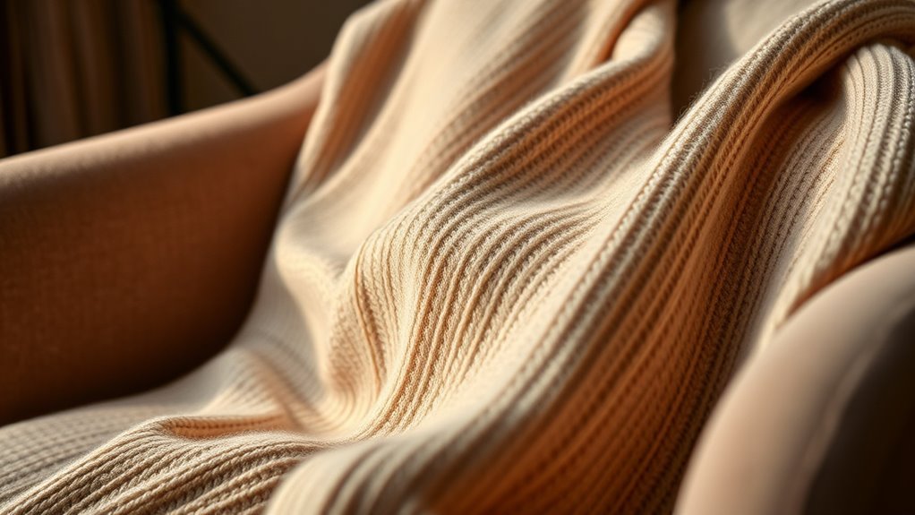 Higher-quality cashmere critically boosts sweater durability because it’s sourced from finer, longer fibers that resist pilling and stretching better. I’ve found that premium cashmere maintains its softness and shape over time, making it worth the investment. Cheaper cashmere, on the other hand, tends to pill quickly and lose its luxurious feel. So, when I buy, I always look for that higher grade to guarantee my sweater lasts and stays beautiful.