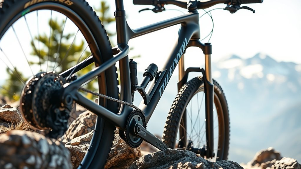Choosing a high-end mountain bike means paying close attention to the frame material, as it directly impacts performance and durability. Advanced materials like carbon fiber and premium aluminum alloys are common in top-tier bikes, offering an excellent strength-to-weight ratio. Carbon fiber frames deliver exceptional stiffness and vibration damping, which means a smoother ride and less fatigue on rough trails. High-quality alloys resist corrosion and fatigue, ensuring the bike lasts longer under demanding conditions. The manufacturing process also matters—aerospace-grade carbon layup or heat-treated aluminum substantially boosts structural integrity. Investing in superior frame materials results in better handling, enhanced performance, and greater longevity, making your ride more reliable and enjoyable over time. That’s why choosing the right material is vital for serious riders.