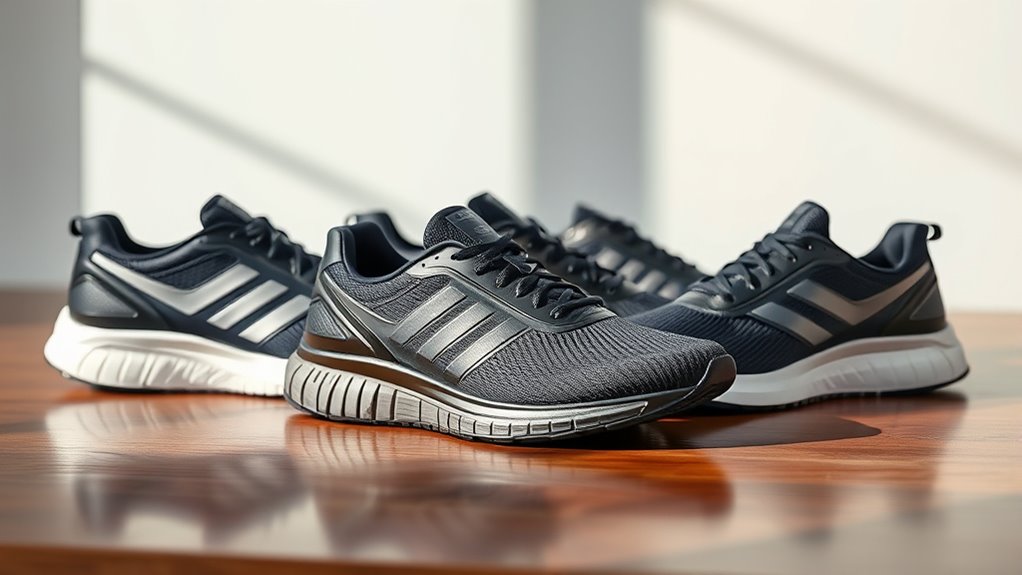 Choosing high-end running shoes that fit well is essential to avoid blisters, calluses, and discomfort during your runs. A proper fit means shoes that are snug enough to prevent slipping but not so tight that they restrict circulation or cause pressure points. Many luxury running shoes offer customizable insoles and adjustable closures, helping you find the perfect fit for your foot shape. Cushioning technology, like gel or foam midsoles, provides shock absorption tailored to your running style and weight, enhancing comfort over long distances. Breathable materials and good ventilation keep your feet cool and reduce sweat buildup, preventing irritation. An ideal fit also includes a secure heel fit to stop slipping and enough toe box space for natural toe splay, ensuring overall comfort and support.
