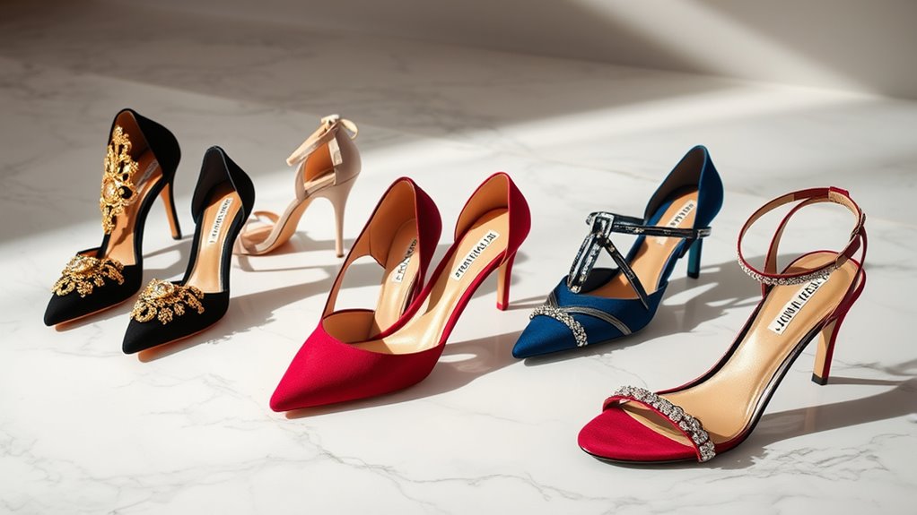When picking high-end women’s shoes, it’s important to contemplate the occasions where you’ll wear them. The design elements, like heel height and structure, should match the event’s formality and activity level. For formal events or parties, stilettos or elegant pumps work best, while loafers or chic flats suit professional settings. Material quality and craftsmanship also matter; premium materials ensure durability and a polished look for high-end occasions. Versatility is key—select shoes that can shift from day to night or from casual to formal. Comfort and proper fit are essential, especially for long events or days involving a lot of standing or walking. Thoughtful consideration of occasion guarantees you feel confident, comfortable, and appropriately styled wherever you go.