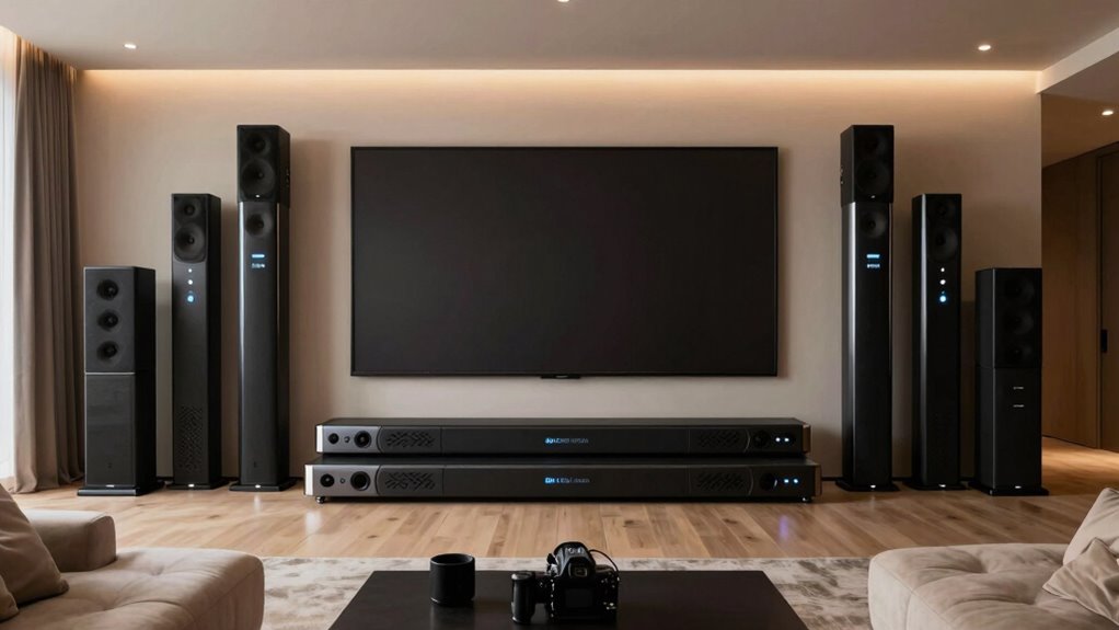 Choosing a Dolby Atmos soundbar means paying close attention to sound quality and clarity, as these factors considerably impact your listening experience. Dolby Atmos delivers immersive, multidimensional audio with height channels, creating a realistic soundstage. High-quality systems support lossless audio transmission via HDMI eARC, ensuring pristine fidelity. Dedicated up-firing speakers and surround channels enhance dialogue clarity and overall sound detail, making every word and sound effect clearer. Advanced DSP technology processes audio to reduce distortion and optimize clarity across various environments. A wider frequency response, typically from 45 Hz to 18 kHz or higher, enriches bass and crisp high frequencies, elevating the audio experience. When selecting a soundbar, prioritize these elements for the clearest, most immersive sound possible.