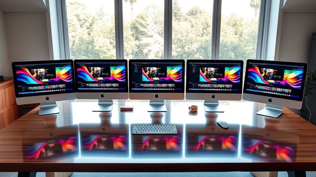 Color accuracy and calibration are vital factors I consider when choosing an iMac for video editing, especially since they directly impact the quality of my work. High color accuracy ensures my edits reflect true-to-life hues, which is indispensable for creating professional-quality content. I look for support for wide color gamuts like P3 and 10-bit color depth, as these features enhance my ability to achieve richer visual tones. Additionally, I prioritize displays that allow for easy calibration using hardware or software tools, guaranteeing consistent color reproduction over time. A high brightness level and contrast ratio improve visibility of color details, aiding in precise color grading. Regular calibration keeps my colors consistent across different projects and viewing environments.