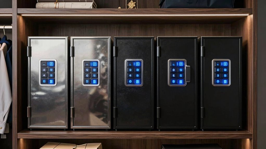 Choosing the right keypad safe for your closet depends heavily on its security level, which varies based on features and construction. Basic safes offer simple password protection, but higher security models include anti-pry construction, multiple lock bolts, and alarm systems that deter forced entry. The complexity of the access code also matters—longer, more intricate passcodes like 8-digit ones considerably increase security compared to 3-digit codes. Some safes add biometric fingerprint recognition or manual override keys for extra control. When evaluating security levels, consider the materials used, the robustness of the lock mechanism, and additional features like tamper alarms. These factors work together to determine how well your safe can protect valuable items from theft or unauthorized access.