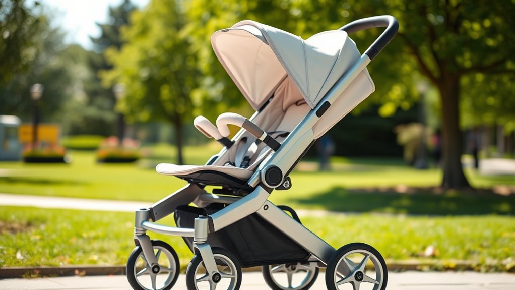 You might think travel strollers have unique safety features, and you’re right. I’ve found they often include easy-lock mechanisms, sturdy harnesses, and reflective accents for visibility. Some even have compact fold locks that prevent accidental collapsing. These features are designed to keep your little one safe and secure while on the go. I always check for these safety details before choosing a stroller for travel—peace of mind is priceless.