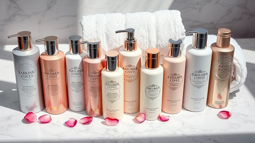 Think of hypoallergenic luxury body lotions as gentle guardians for sensitive skin. Yes, many high-end sets include options free from common irritants like fragrances and dyes, making them perfect for delicate skin. I’ve found that brands like La Roche-Posay and Avene offer luxurious, hypoallergenic choices that soothe without causing reactions. These sets feel like a soft embrace, providing nourishment and elegance without compromising your skin’s comfort.