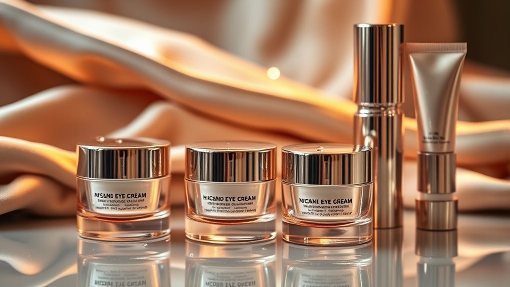 Since the delicate skin under your eyes absorbs products quickly, selecting a luxury eye cream with the right texture and absorption properties is essential for effective results. A lightweight, silky formula that penetrates swiftly guarantees active ingredients work where they’re needed most, without leaving a greasy or sticky residue. The absorption rate is key; creams that sink in within seconds maximize benefits and prevent pilling or discomfort. Texture also impacts how well the product layers under makeup or other skincare—non-oily, non-comedogenic options are ideal for seamless application. While richer creams can offer more hydration, they tend to take longer to absorb, which might cause irritation or uneven application. A smooth, velvety consistency helps distribute the product evenly, ensuring consistent delivery and minimizing irritation.