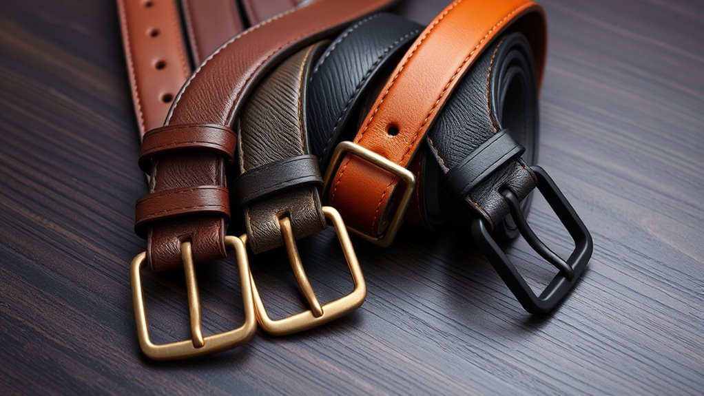 You might think all belts fit the same, but specific styles suit different occasions. For formal events, I prefer sleek, minimal leather belts with a polished buckle; they add sophistication without distraction. Casual settings call for more relaxed styles like textured or woven belts, offering comfort and personality. Choosing the right belt elevates your look and guarantees you’re appropriately dressed, whether you’re at a business meeting or a weekend outing.